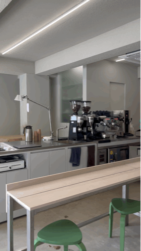 벽 선반처럼 생긴 테이블이 있는 공간 3곳과, 주방 안쪽을 바라보는 일자형 테이블 하나(초록색 의자가 아주 포인트죠?)